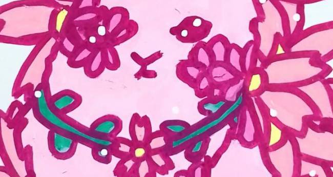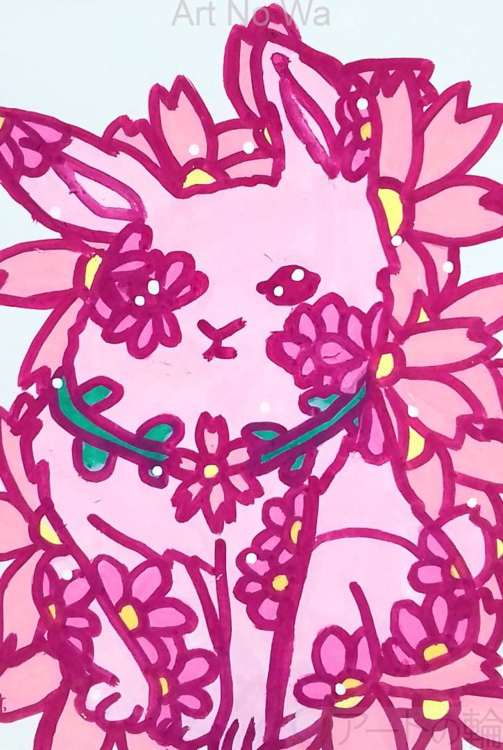 ピンク色のコスモスの花言葉「純潔」をモチーフに凛々しい顔の兎を描いてみました。