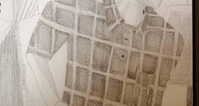 お肉を見てほほえんでいる幸せそうな彼を描きました。