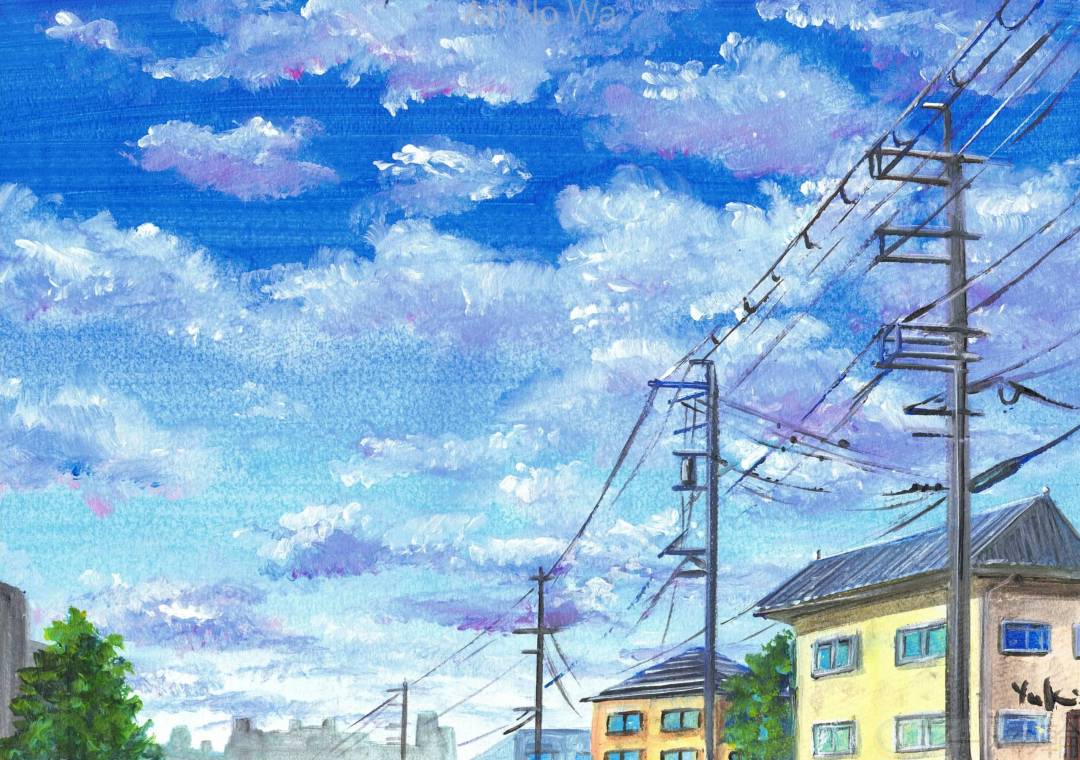 電柱と家のある風景です。空に浮かぶ雲は高く、沢山あります。空の広がりをも感じさせてくれる様に浮かぶ雲。涼やかな空気と共に、秋の訪れを感じる。そんな一枚です。