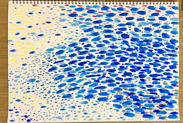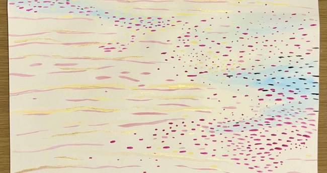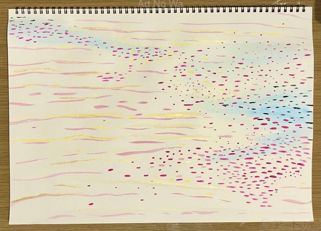 花びらが川に吹き込んで筏になっている様子をかいています。柔らかな陽光にさざなみも淡い春の色に染まっています。