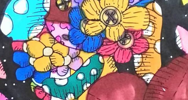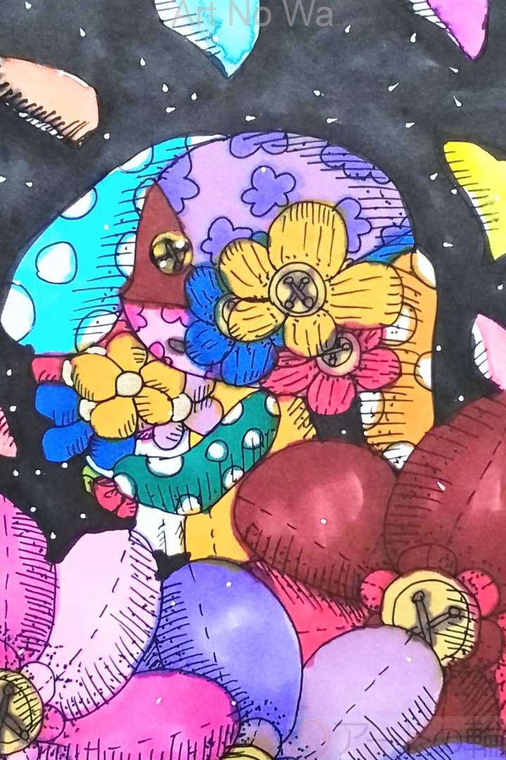 夜空の中でぬいぐるみの犬を優しく包んでいるパッチワークな花を描いてみました。