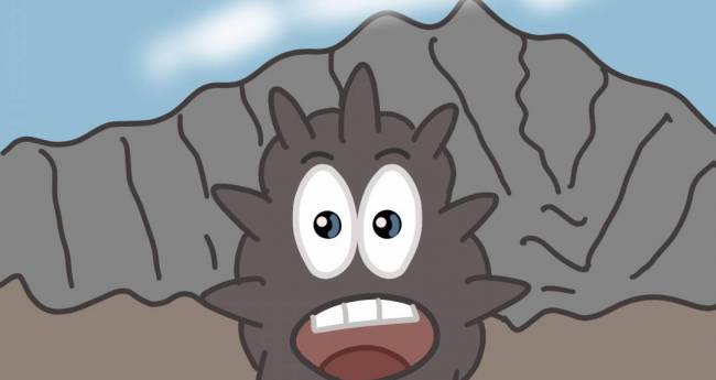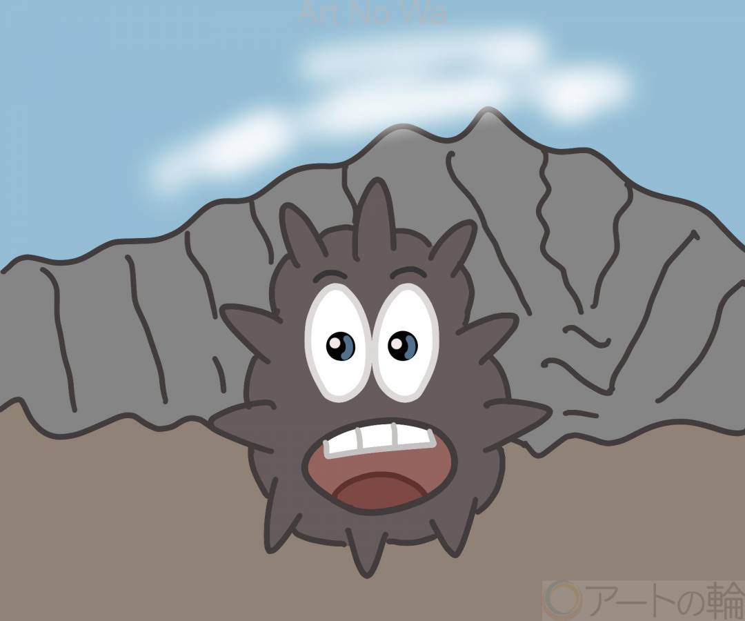 非現実,屋外,自然,山,空,赤,水色,白,黒,想像上の生き物,風景,明るい,たのしい,かわいい,わくわく