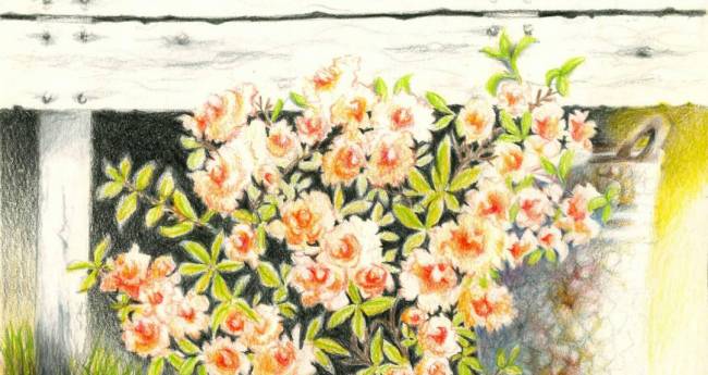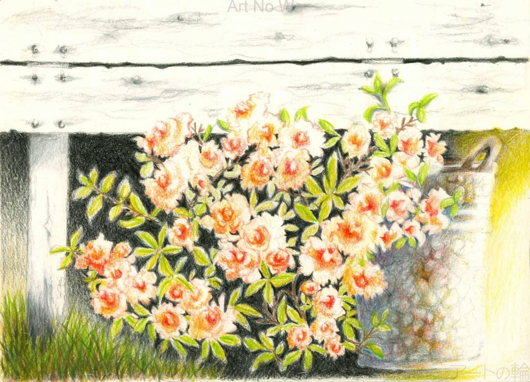 花言葉「節度」「慎み」「恋の喜び」㋃から㋄頃に公園や街路樹の低木として、赤やピンク白など鮮やかな花色を咲かせます。この色鉛筆画はわが家の軒下で錆びたバケツの間からひっそりと顔を出して咲いてくれました。
