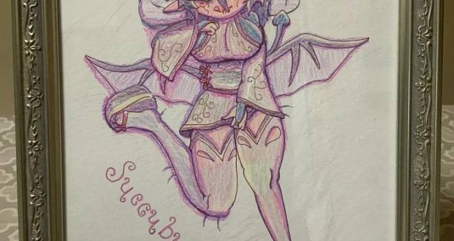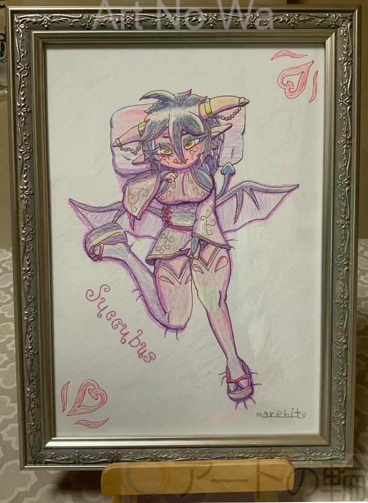 眠ってる男の夢に現れて精を吸う淫魔サキュバスを描きました。A4サイズの作品。
