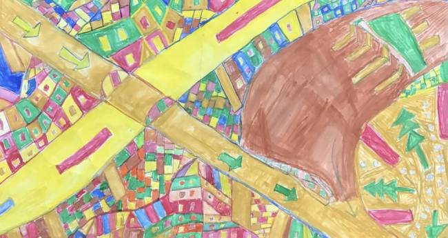 冬の高速道路を描きました。高速道路の下には町があります。