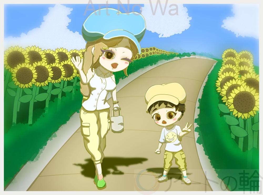 現実,屋外,公園,夏,黄色,人物,植物,男性,女性,大人,子供,明るい,たのしい,かわいい,わくわく