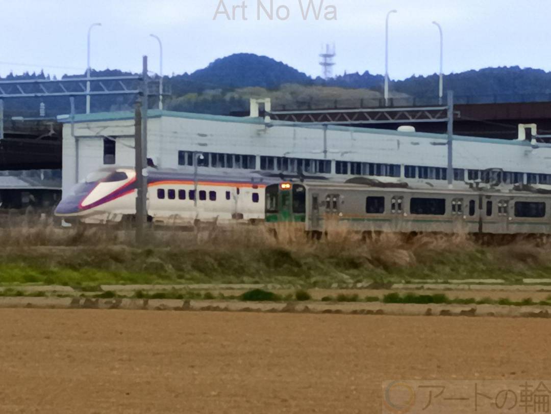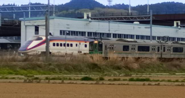 利府線の701系と新幹線車両基地に止まっていたE3系山形新幹線つばさのツーショットです。