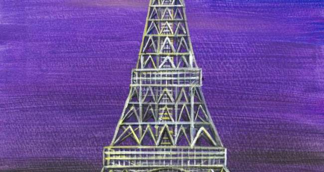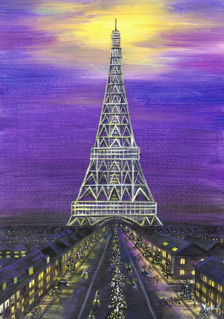 霧の深い空に月が出て、辺りを照らしています。ライトアップされて浮き上がる塔は、霧を晴らすかの如く立っています。家の明かりも灯り始め、どこかあたたかい印象となる。優しくも力強いこの風景の中に行きたくなる様な一枚を目指して描きました。