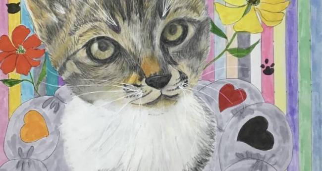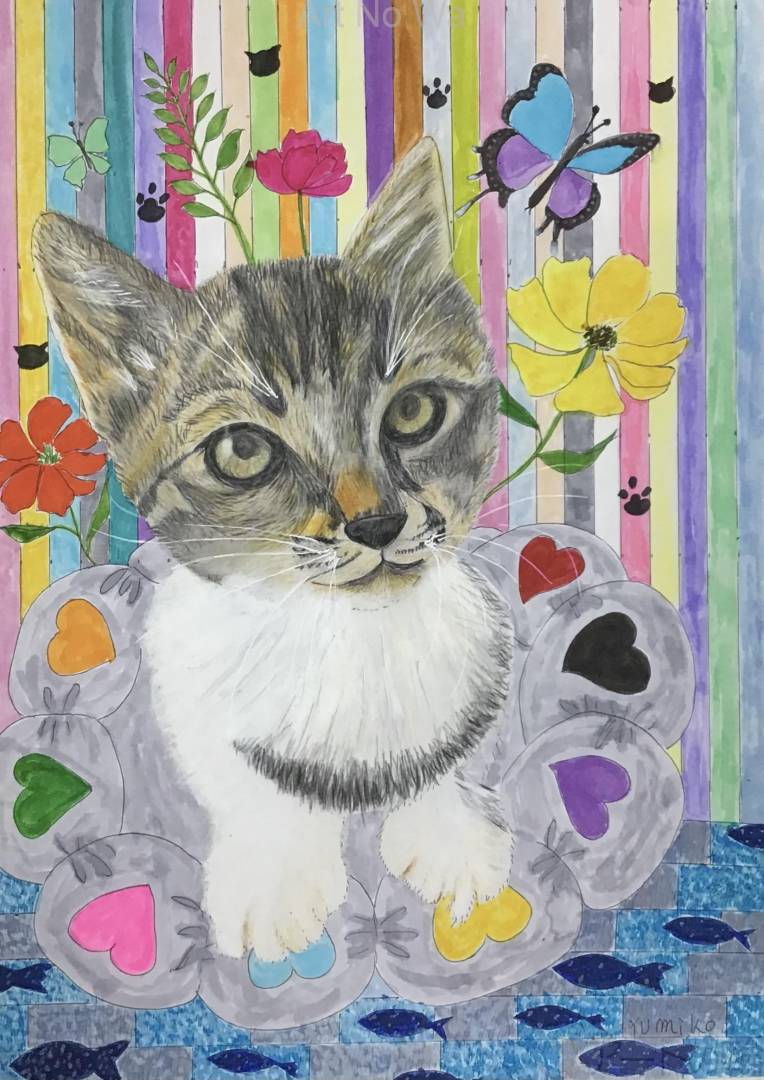 家でリラックスしている猫を描きました。色鉛筆と絵具を使って描いたので大変でした。