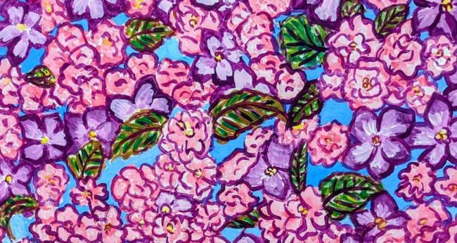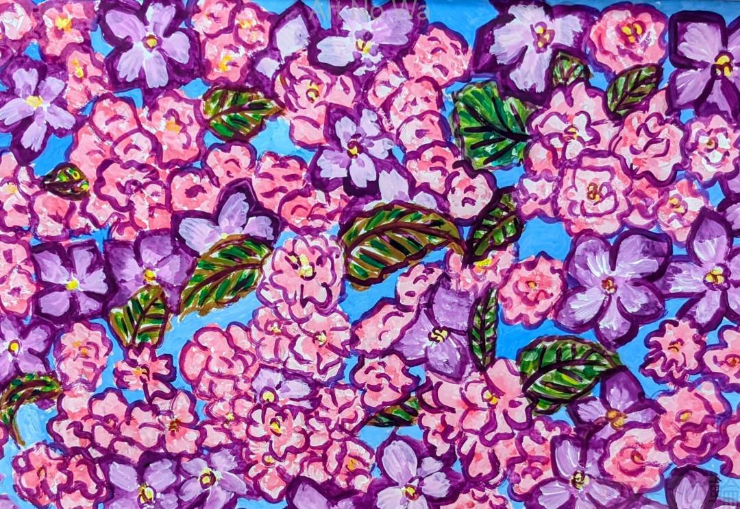 濃いピンクの八重桜に紫のニチニチソウがバランス良くなるように描きました。