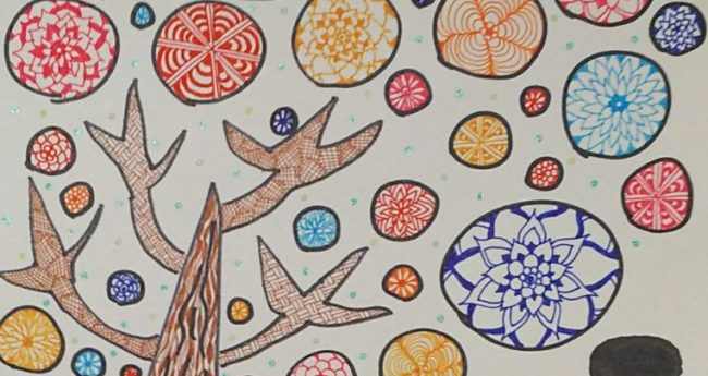 円いシャボン玉にゼンタングル風の模様を描いた作品