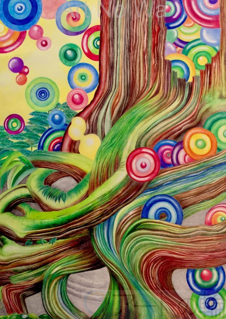 作品コメント:樹齢800年を越える大樹をみた。普通の木の幹の太さくらいある根は幾重にも絡まり、苔が生えている。この木は私たちの知らない色々な歴史を眺めてきて、今を生きている私たちが亡くなっても、更に生き続けてどんな未来があるのかも眺めていくのだろう。その大樹がそこに居続けるには、戦争もなく、環境汚染もなく…でないとありえないのだろうな、と思った。