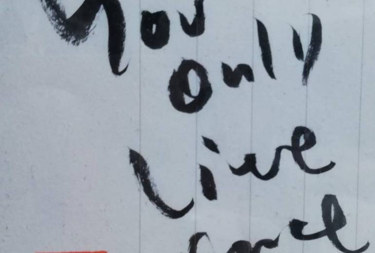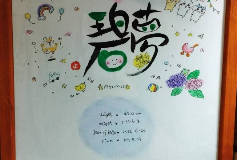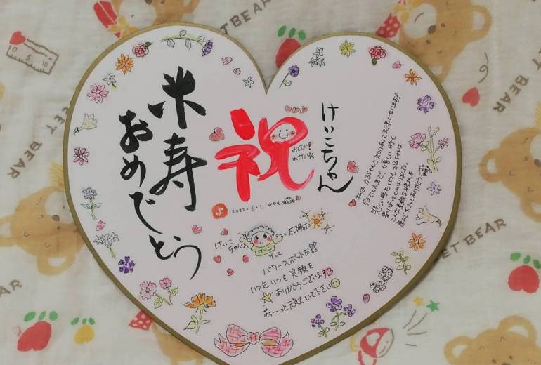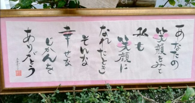 私が、障害者となり、初めてリハビリ室に行った時、そこは濃いグレーの絵の具で描かれた暗い世界でした。自由に動けない私にうんざりし、放置されては、シクシク泣く日々でした。厳しいリハビリを乗り越え、再び筆を持つ事が出来たとき、私の作品を見て感動して下さる同じ障害のお友達がいました。そこで、私は、リハビリ室に作品を置かせて頂けたなら、より多くの方を笑顔にできるかもしれないと思い、笑顔になるような作品を目指して、作成致しました。この作品は、お世話になった病院のリハビリ室に飾って下さっています。