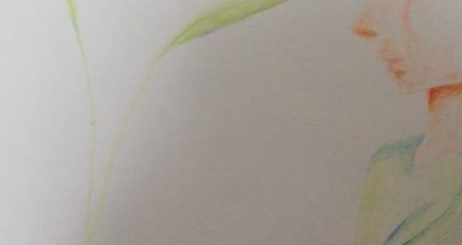 てんとう虫付きの葉っぱを女性が男性に差し出しています。急に色鉛筆が使いたくなって作った作品です。