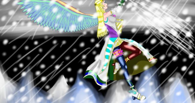 天使の女性キャラクターのヴィーナス・レノンの右横の姿です。イメージカラーは青と緑です。右手に氷雪と疾風のエネルギーとして集まり、彼女の表情が少し寂しさと優しさの癒しさです。背景の風景は雪山と雪風と雪雲に描かれています。