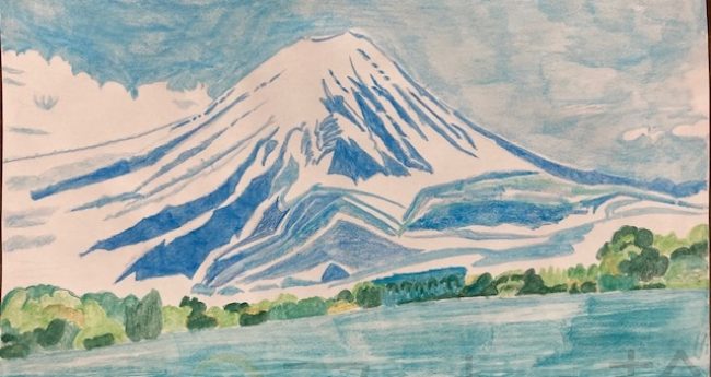 画面が明るくなるように空の色を工夫しました。山の稜線が美しいと感じています。湖面の色が難しかったですが、さざ波の動きはうまく表現出来たと思います。
