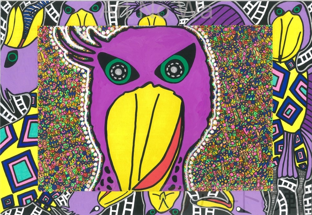 27.2×39.4cmのボール紙にA4サイズのボール紙を貼り付けて、A4サイズのボール紙にハシビロコウを描き、その周りにマジックペンや蛍光ペンで少し目がチカチカするような模様を描く事で、獲物を狙うハシビロコウの、一見無表情のようでギラギラした覆面レスラーのような瞳を強調したこと、足だけミリペンでやたら細かく描き、“なんだかわからないけどなぜか何回も見たくなる気持ち悪さ”を出す事にこだわりました。(自分が中毒性のある気持ち悪いものフェチなので)