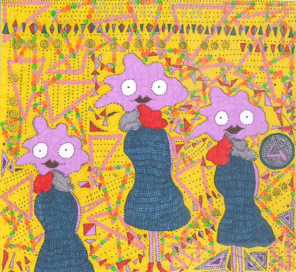 この作品は、自分の大好物である菊芋を眺めていたら、どろどろと土臭くゴツゴツしていて「根菜類って、この土臭さがたまらないんだよな~、特に菊芋はそこに一癖あるのがまた、たまらん!しかもイヌリンがいっぱい含まれていて美容健康にもいいなんて「神」だな~」とか考えていたら、なんとなく母親を思い出し、脳内がなぜか「菊芋+母親」になってそれが、「菊芋おばさん」というキャラクターになり、分裂してトリオになっちゃって、そのイメージをそのまま表現したらこんな感じになりました。