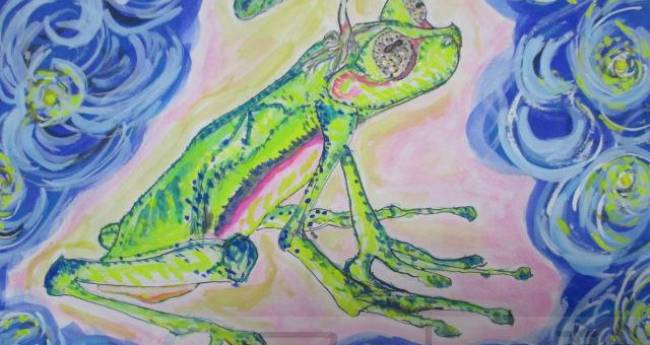 植物の苗ズッキーニを、運ぶカエル カエルの頭に苗が付いて、困った! カエルは、これからどうするか、考える