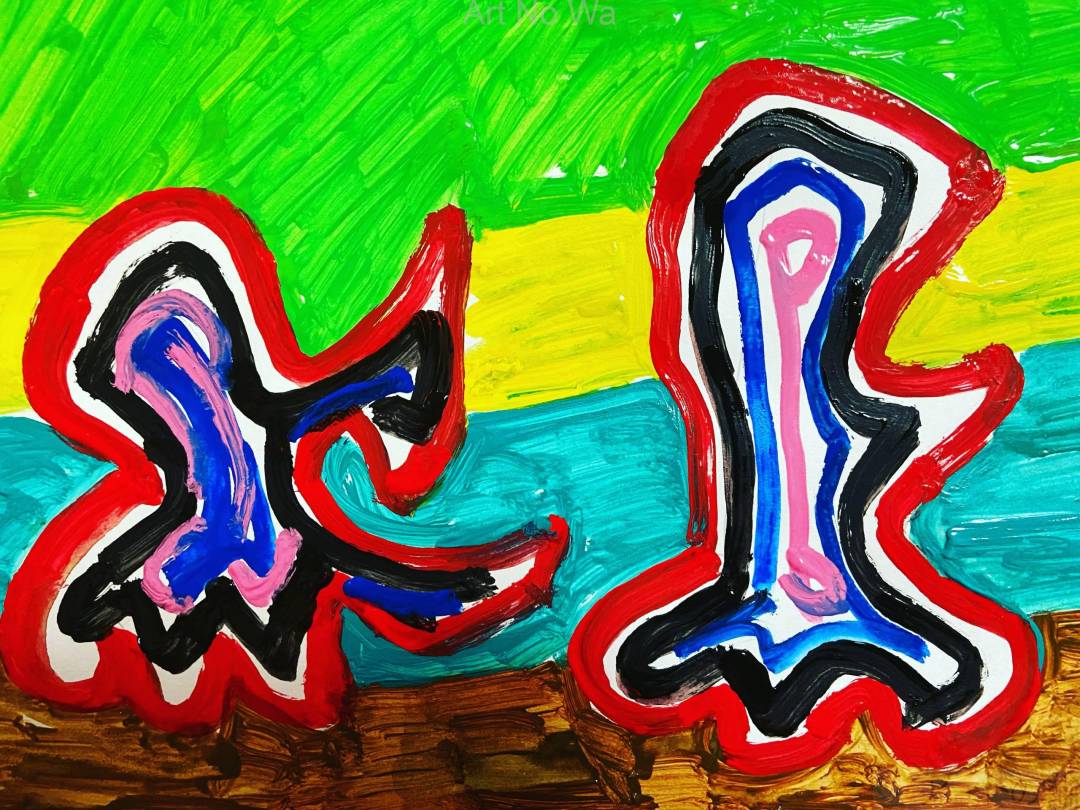非現実,屋外,太古,赤,黄色,緑,青,黒,想像上の生き物,どきどき,2D