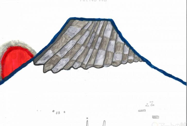 彼は一筆書きのように1本線で何の迷いもなく描き進めて行きます。力強い線で、着色も縞のように2色で区切って着色します。額であろうと食べ物であろうと2色分けするのが彼の個性です。