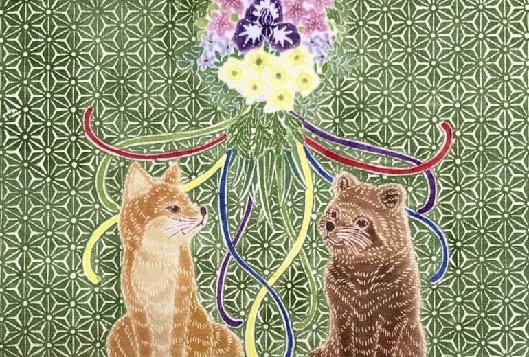 現在は型染めの手法で描いた作品をメインに、消しゴムハンコやiPadでの製作も行っています。