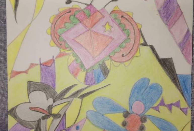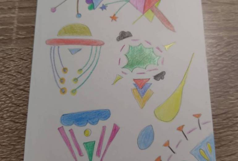 色鉛筆を使って、模様を作りオリジナルの世界観を作っています。絵を通して、見ている人に明るい気持ちになって欲しいと思い描いています。